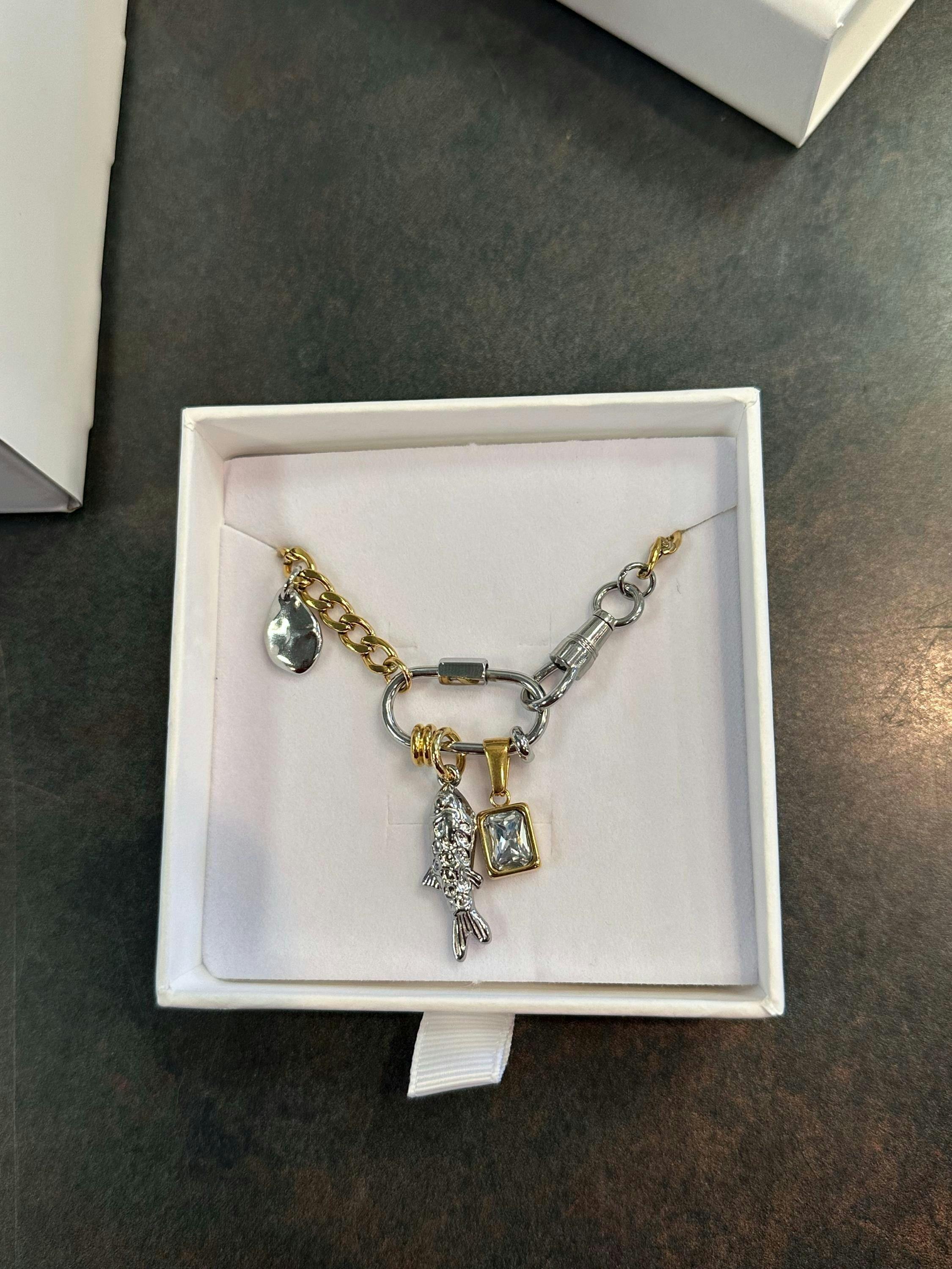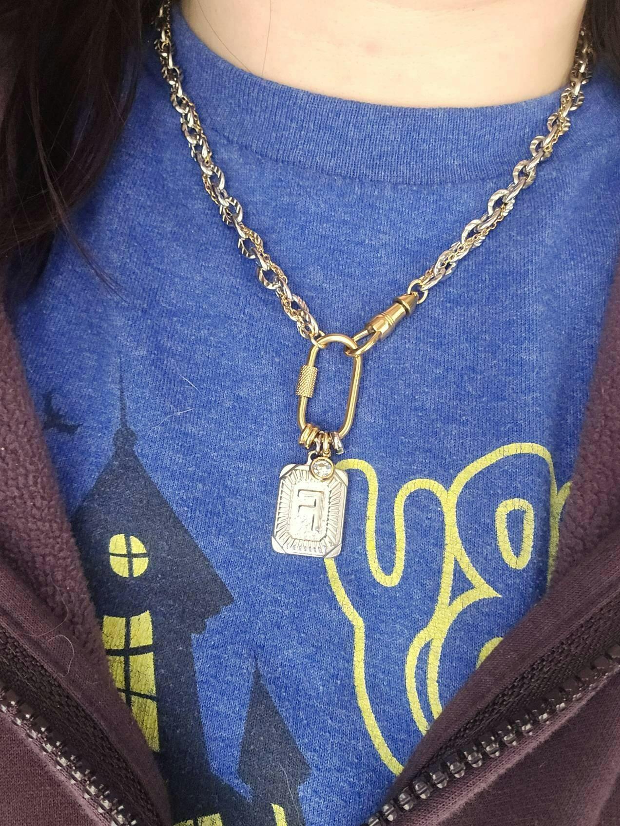 Mixed Metal Initial Necklace – Two-Tone Stainless Steel Chain with Carabiner, CZ Crystal & Letter Pendant