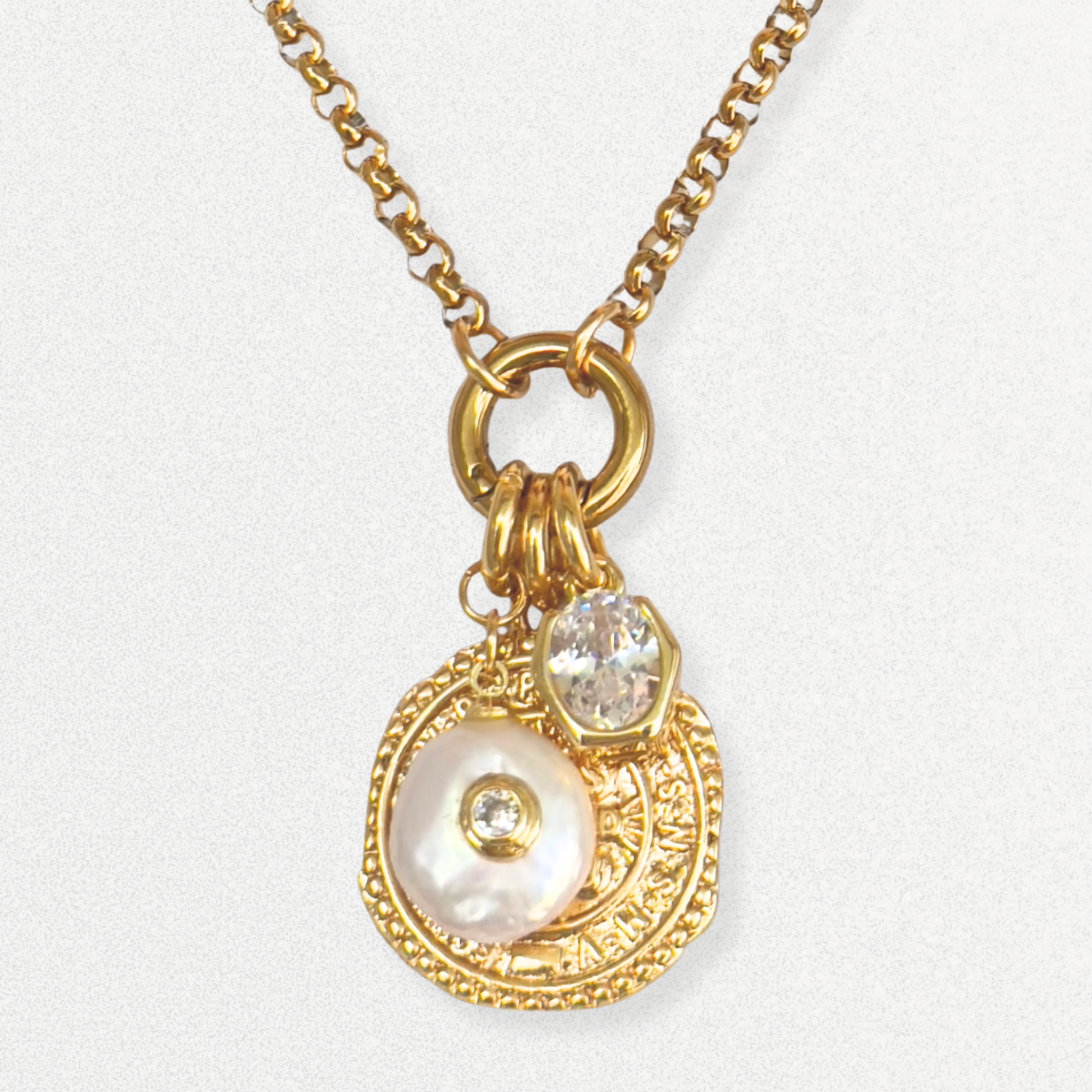– Gold filled coin charm, genuine baroque pearl charm with CZ center, oval CZ crystal charm