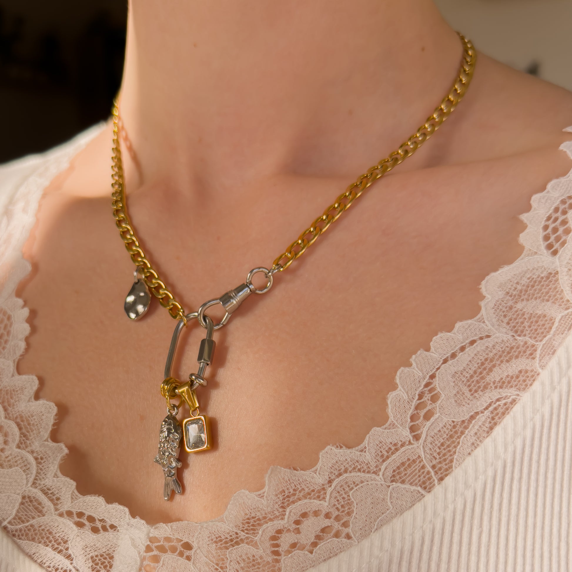 – Charms include: silver fish charm, gold CZ charm, abstract hammered charm