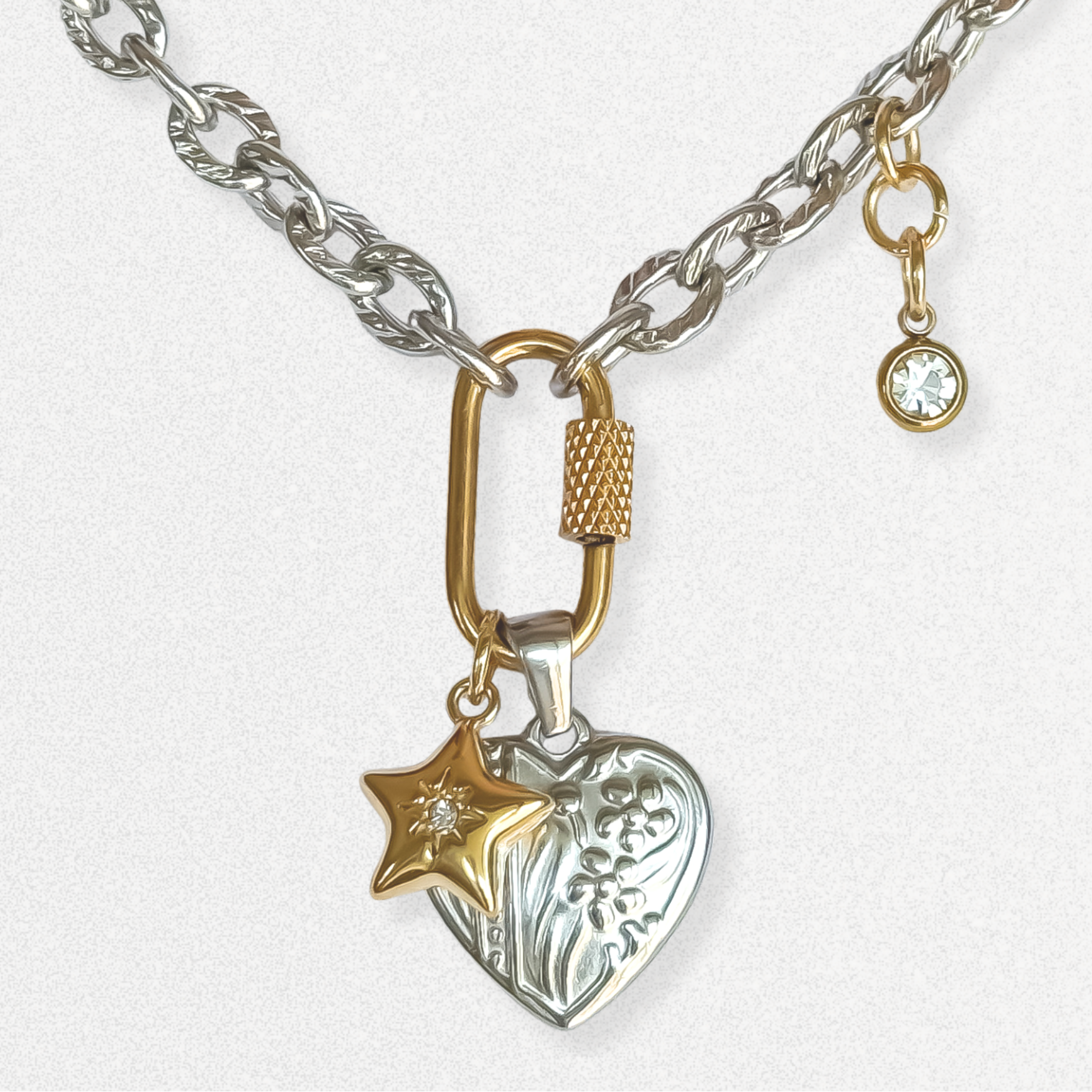 – Chunky stainless steel chain with twist carabiner front clasp